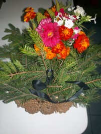 Szárhegyen szedett fenyőágakból és tobozokból, Gáspár Józsi kertjéből szedett virágokból, Cila által kötött koszorút helyeztek el.